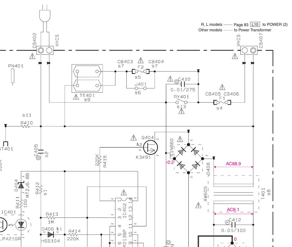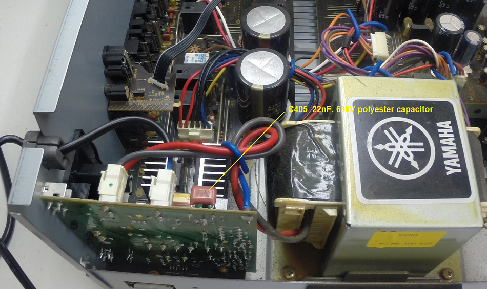 section, the C405 capacitor - a 22 nF, 630 V polyester type is often