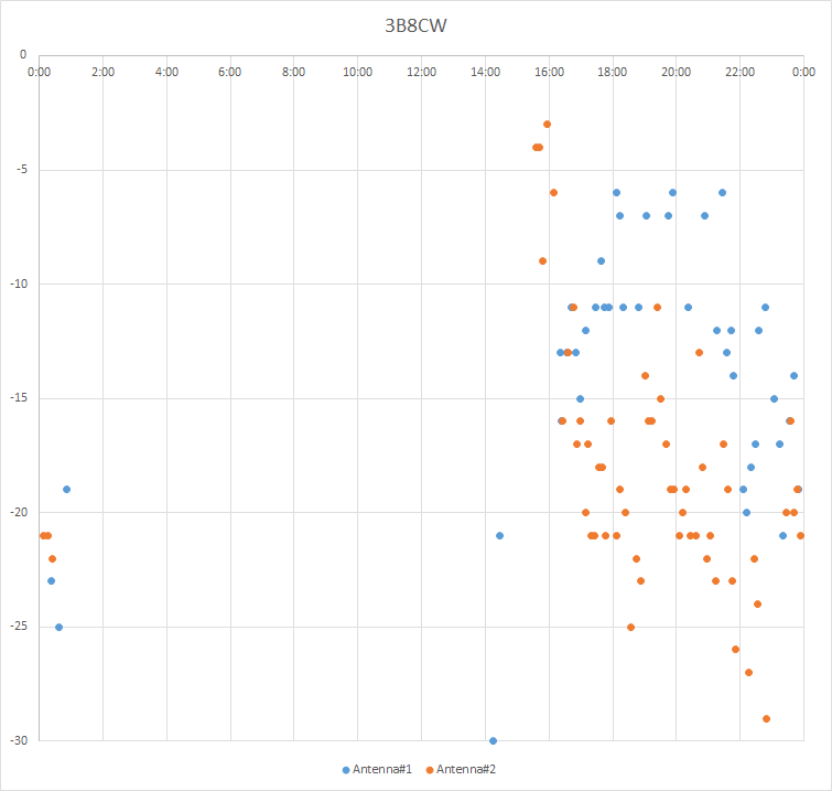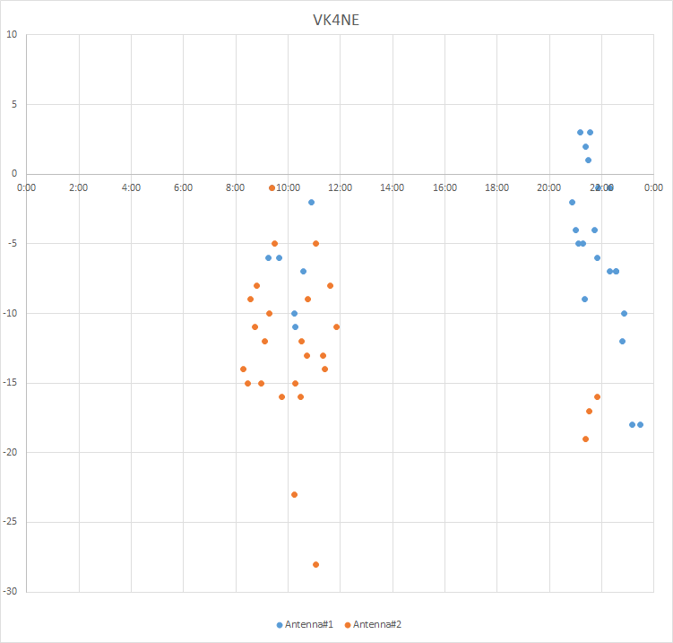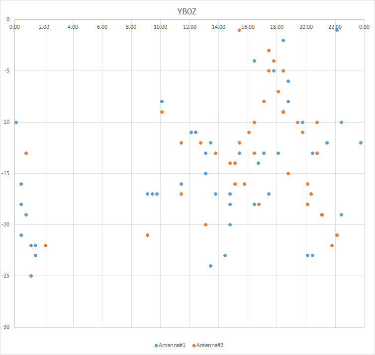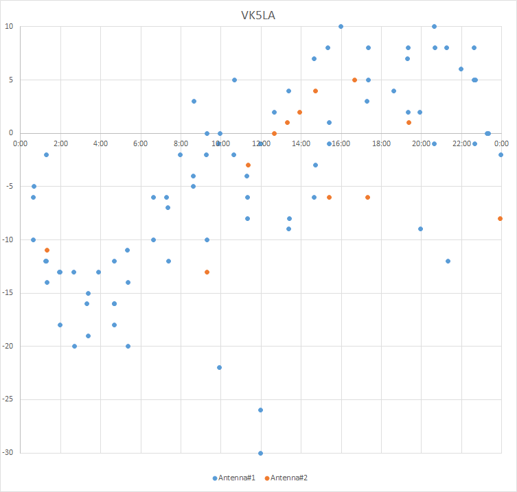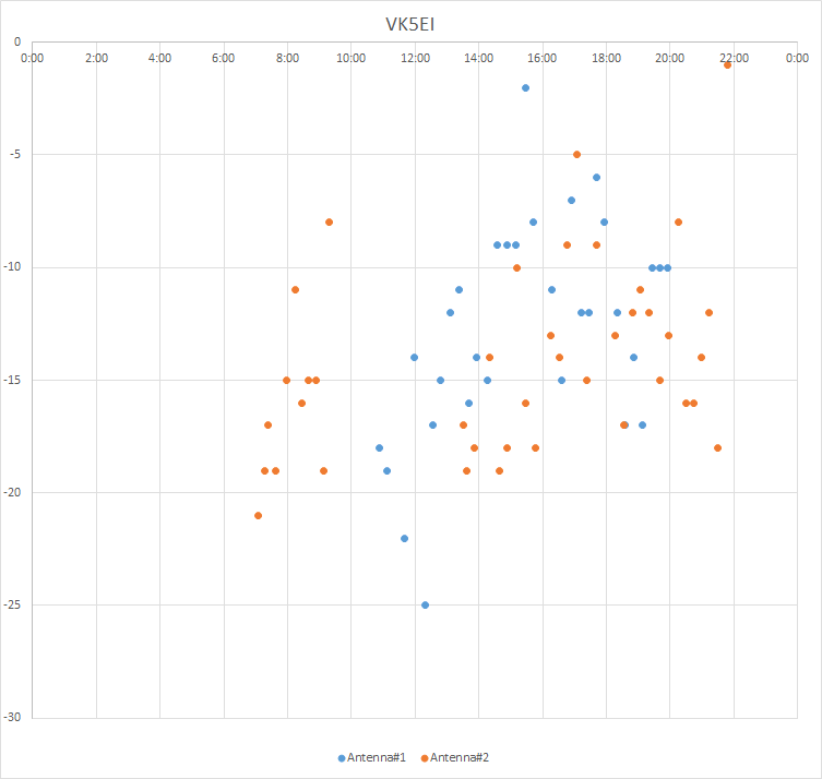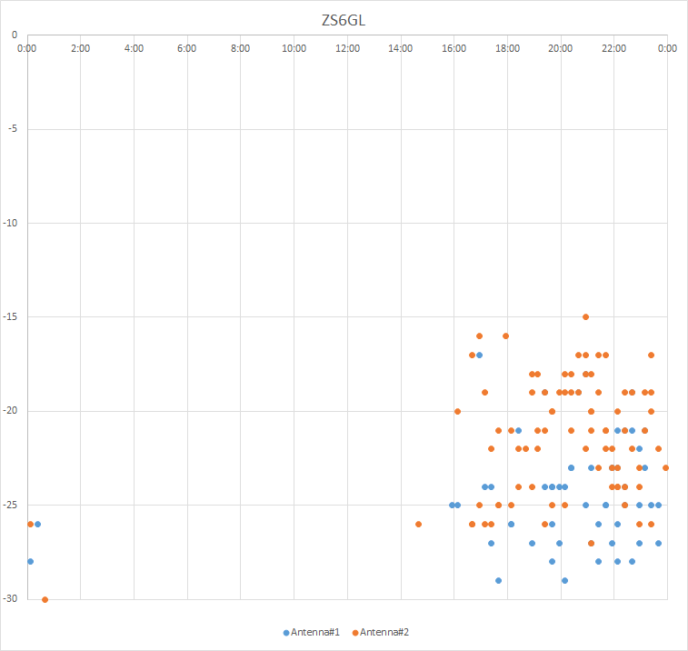 Excel. Horizontal axis = UTC Time, Vertical axis = dB below the