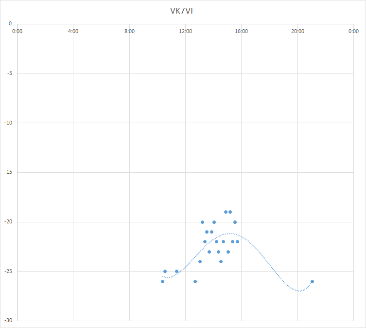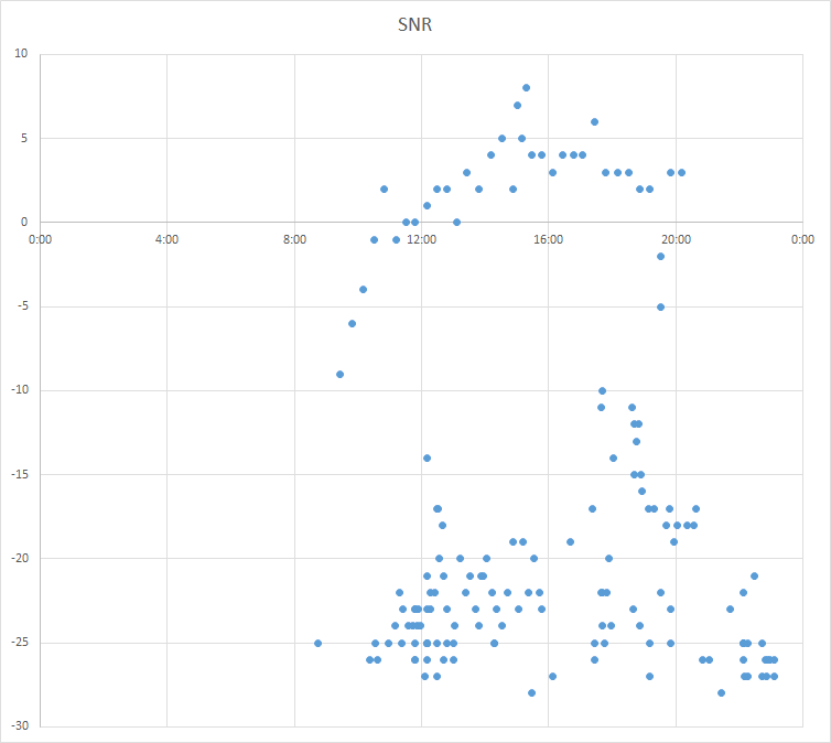 showing SNR against UTC time, Vertical axis = dB below the