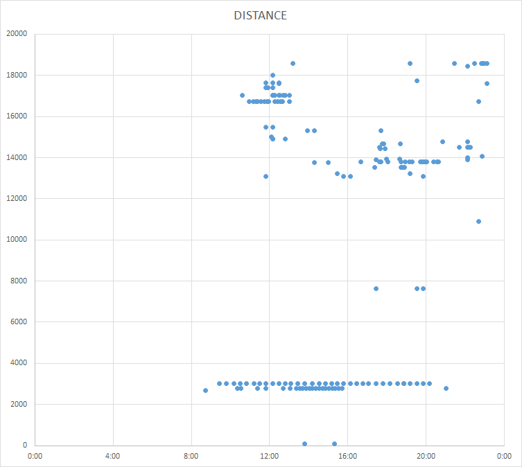band activity data recorded for a 24 hour period on the 22/03/2017 showing distance in km against UTC time.
