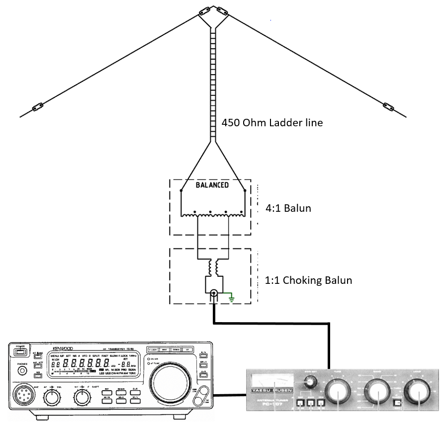 side. The feed point is connected to an 8m length of 450-ohm ladder