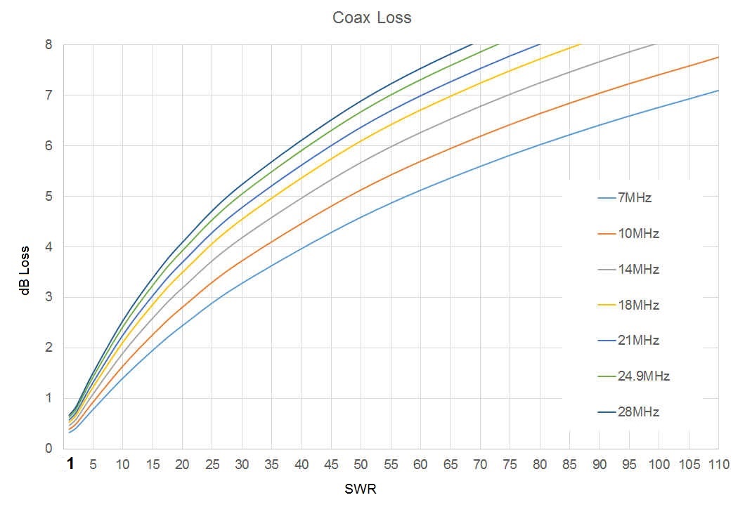 shows coax line losses (Vertical axis) for a 10m length of coax at