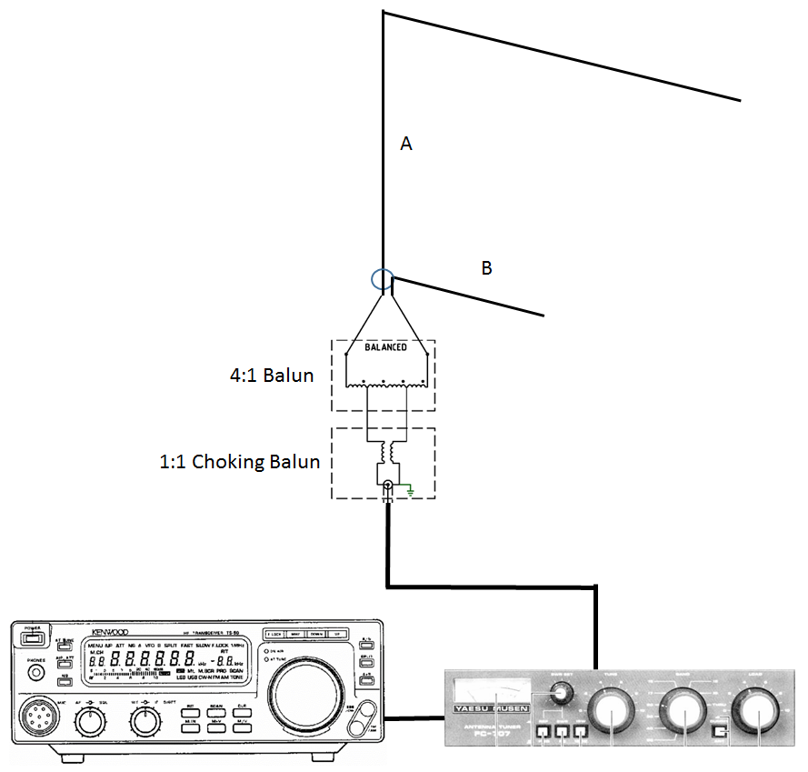 antenna is fed through both a 4:1 balun and a 1:1 choking balun. A