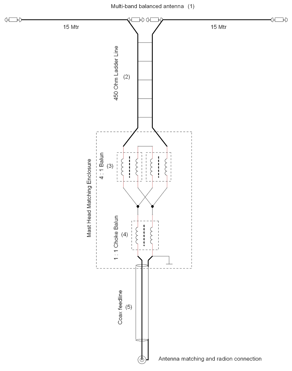 Doublet, feed-lines and balun configuration.