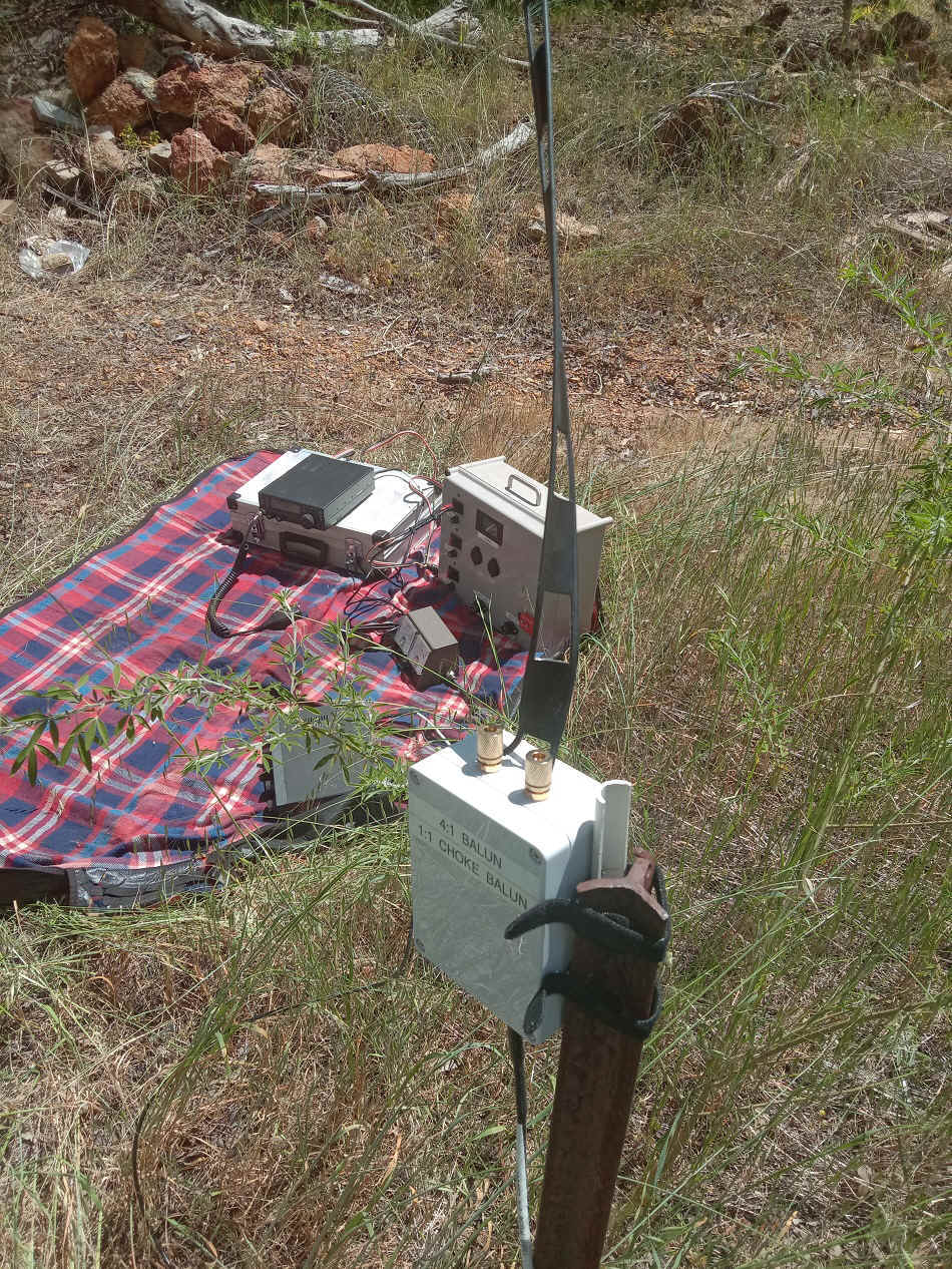 on the ground radio equipment with balun connection to the open wire transmission line in the foreground.