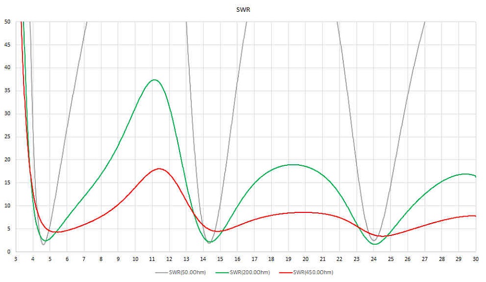 (50 Ohms), 4:1 balun (200 Ohms) and 9:1 balun (450 Ohms). The chart