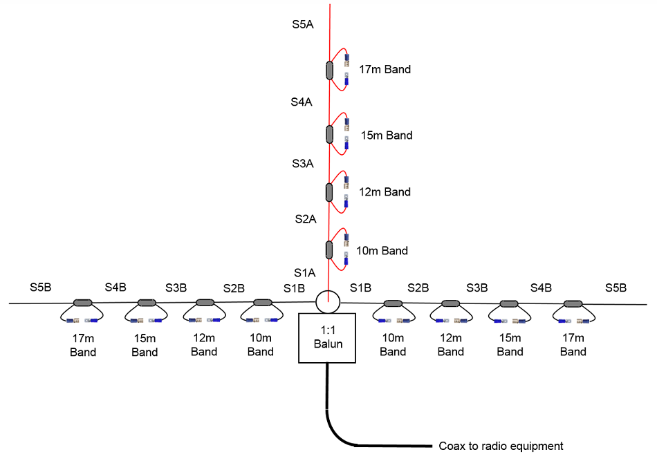 wire with each element (the radiator and three radials) being divided into linked sections that can be connected or isolated to set the operating band.