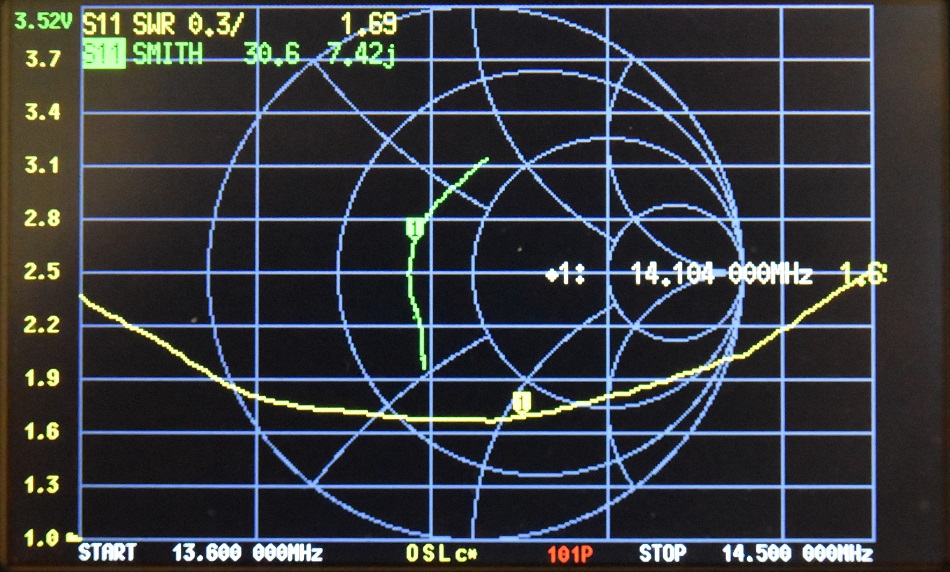 NanoVNA SWR and Smith Chart results, showing the SWR being below 2.5:1 from 13 MHz to 14.5 MHz