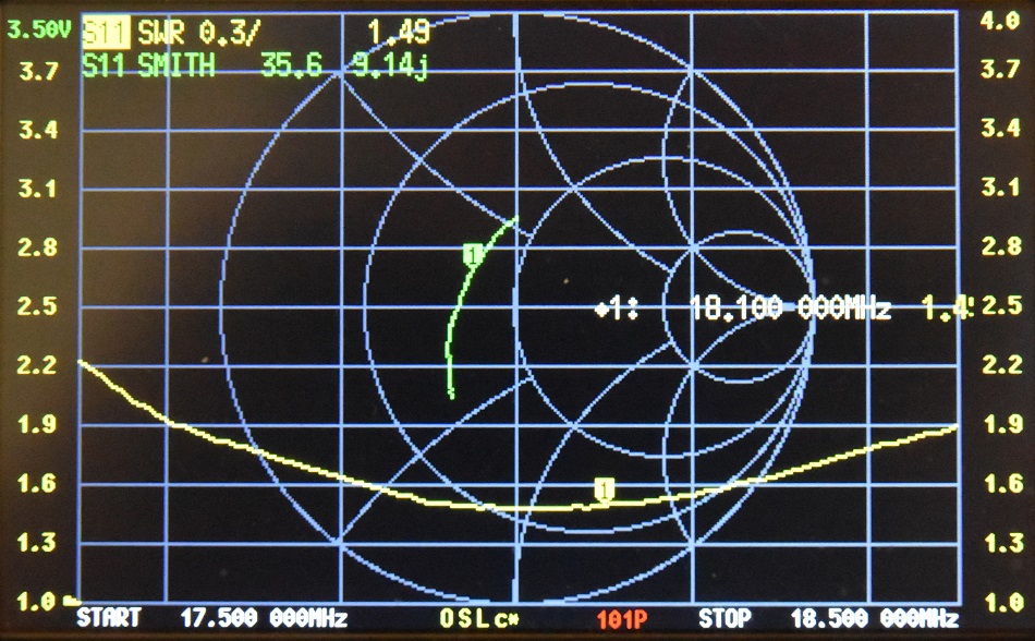 NanoVNA SWR and Smith Chart results, showing the SWR being below 2.2:1 from 17.6 MHz to 18.5 MHz